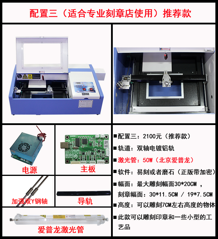 配置二:立式刻章機(jī):單一鏡片,無需調(diào)節(jié)光路,占地面積小,采用雙向四軸鋼軸設(shè)計(jì)。雕刻幅面:12*8厘米左右,配正品北京愛普龍激光管。40W:2200元 50W:2350元