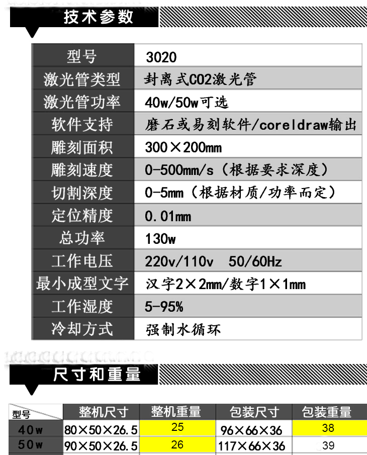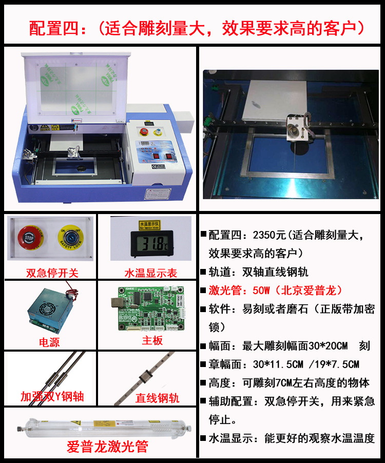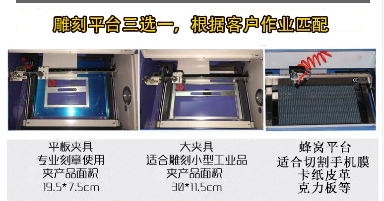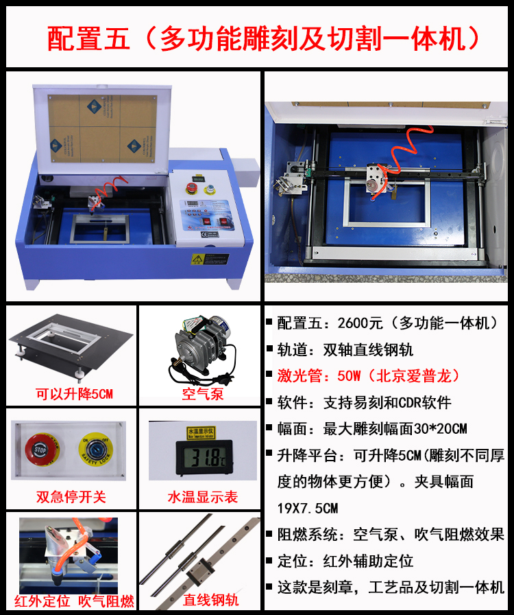 紅外定位,吹氣阻燃,電磁氣泵,升降夾具平臺(tái),蜂窩平臺(tái),支持CDR軟件直接雕刻,切割,速度快,雕刻耐磨損。采用北京愛普龍50W激光管。價(jià)格:2600元
