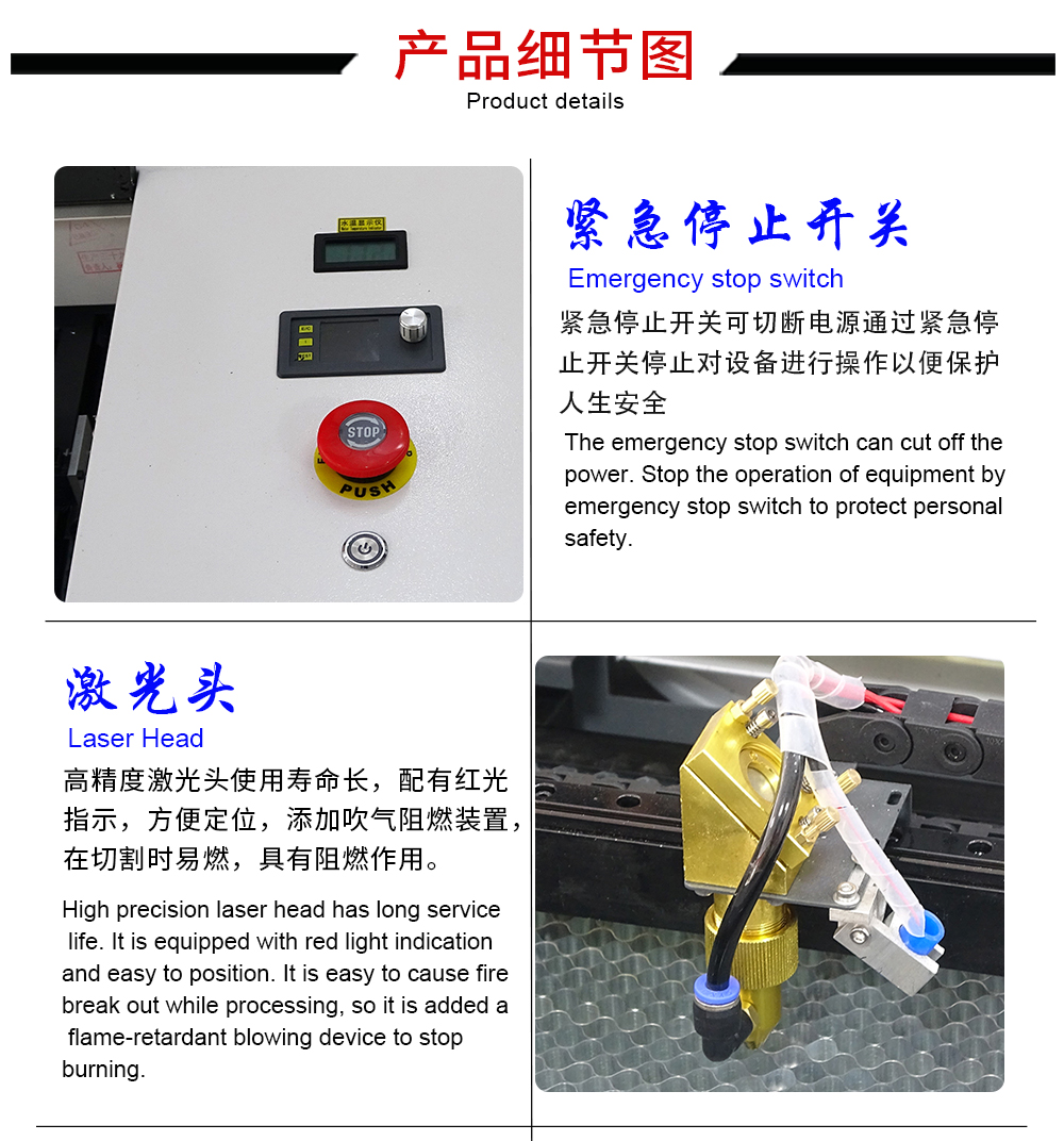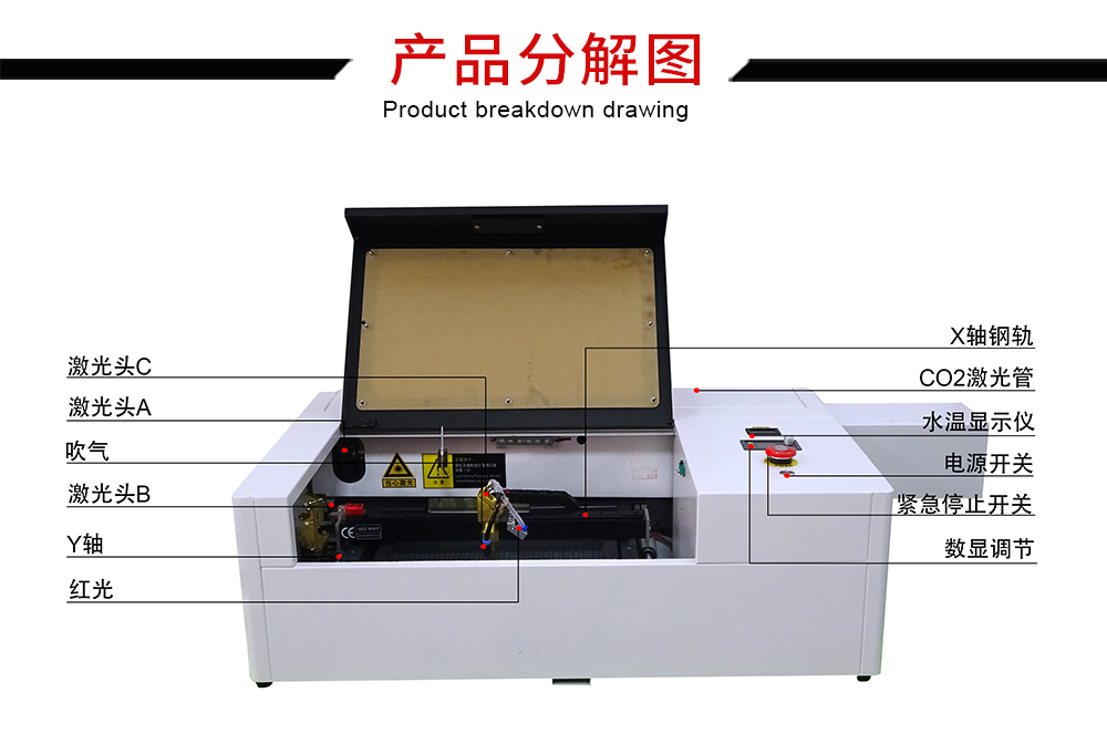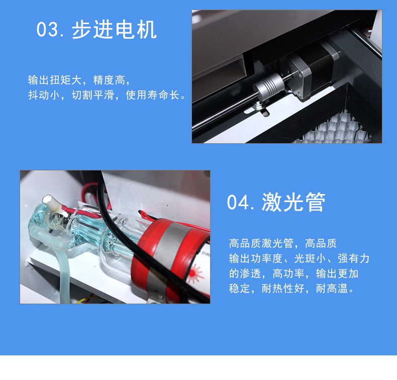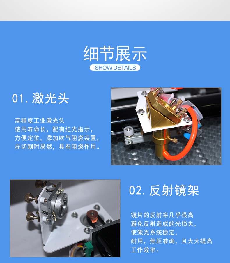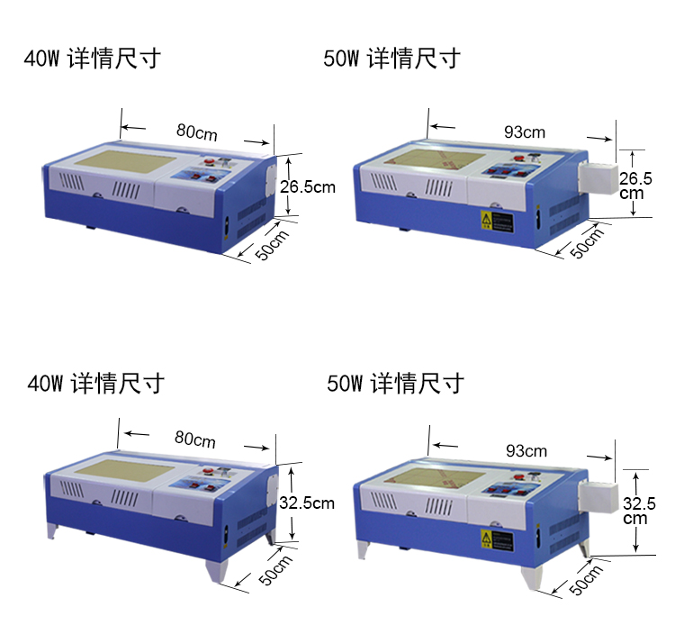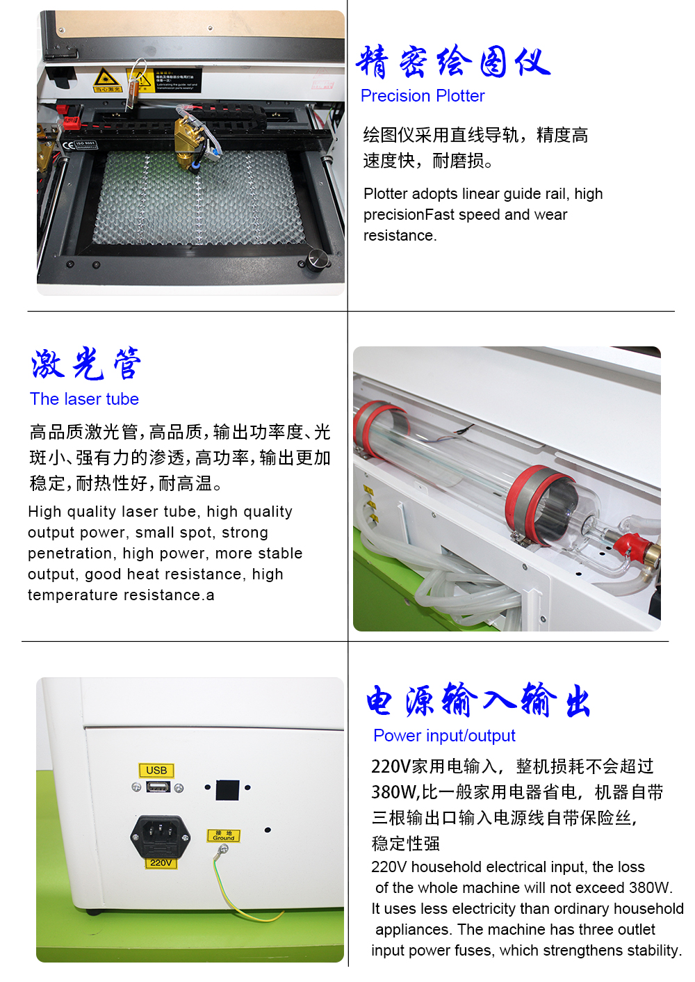 新式60W: 60W激光管(專業(yè)定做用于這種小型)智能顯示屏(有智能排除故障參考功能, 電源或是激光管壞了上面會(huì)有相關(guān)的顯示)、內(nèi)置手動(dòng)升降裝置、吹氣阻燃、直線高速導(dǎo)軌(速度快、精度高)+工業(yè)級鑰匙加密+急停止開關(guān)+水溫監(jiān)測系統(tǒng)(可以隨時(shí)檢測循環(huán)水溫度)、專業(yè)出口激光電源(定制用于出口的激光電源)、采用M2板卡(支持CoreLaser、CDR直接輸轉(zhuǎn)換輸出,),工業(yè)級激光頭、紅光定位系統(tǒng) 、雙坦克式導(dǎo)鏈裝置+金屬反光鏡片、導(dǎo)軌采用高速直線方軌。