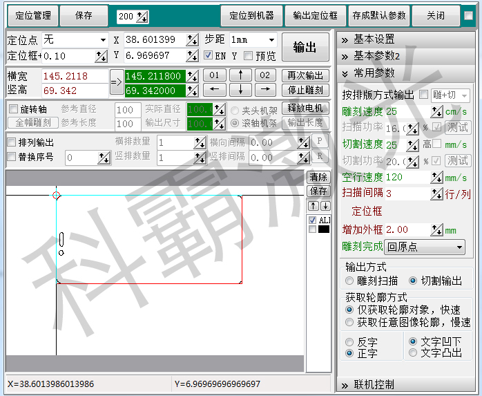 配置:雙軸直線鋼軌軌道 50W正品北京愛普龍激光管(保證正品,假一賠十) 數(shù)顯電流顯示表 帶有水溫顯示 雙急停開關(guān) 升降夾具平臺(tái) 吹氣阻燃系統(tǒng) 紅外定位 蜂窩網(wǎng)狀平臺(tái) 工業(yè)級激光頭 乾城彩屏脫機(jī)系統(tǒng)(支持CoreLaser、CAD直接輸轉(zhuǎn)換輸出) 支持分層分色輸出,斷電續(xù)雕 雕刻+切割一次完成,U盤傳輸文件加工,脫機(jī)工作。